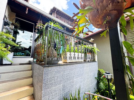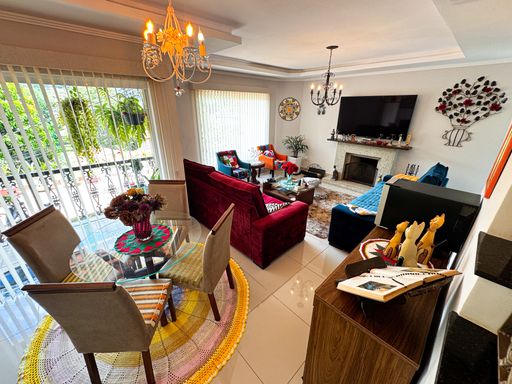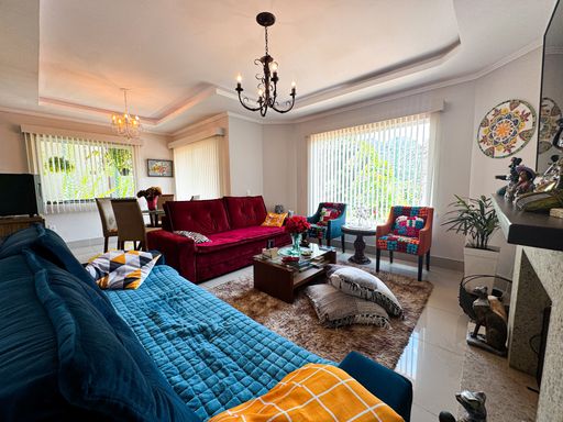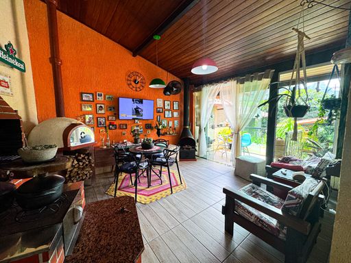 A área social conta com duas salas amplas, sendo a principal em dois ambientes com lareira, varanda e vista aberta para a Mulher de Pedra, criando um cenário único para o dia a dia. A casa possui ainda cozinha com armários planejados, despensa, banheiro social e escritório, além de duas entradas independentes que trazem mais praticidade e privacidade.