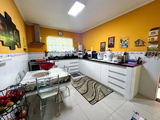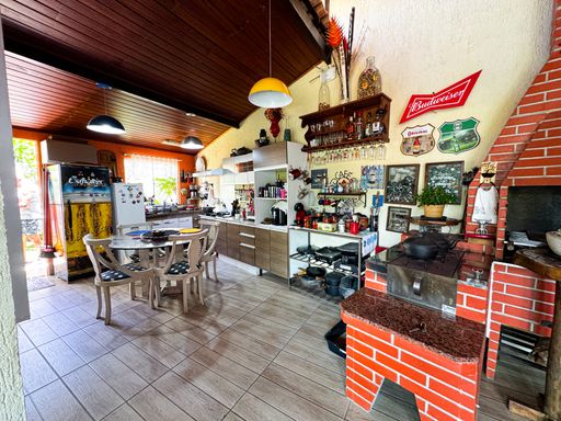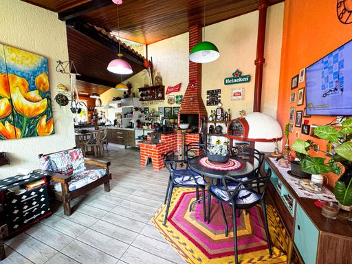 Um dos grandes diferenciais é o espaço gourmet completo, com cozinha integrada à sala de TV, lareira, churrasqueira, forno a lenha e fogão a lenha, além de varanda e lavanderia, ideal para quem valoriza receber bem.